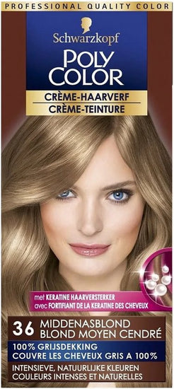Schwarzkopf Poly Color Crème Haarverf 36 Midden Asblond is een professionele permanent kleurcrème die je haar langdurige dekking en stralende kleur geeft. Deze formule levert intensieve pigmentatie, verbergt grijs haar en behoudt de kleur gedurende meerdere weken zonder snel te vervagen. Dankzij de crème-textuur is de toepassing zacht voor het haar: de kleur verdeelt zich gelijkmatig, hecht diep in de haarstructuur én draagt bij aan glanzend resultaat.