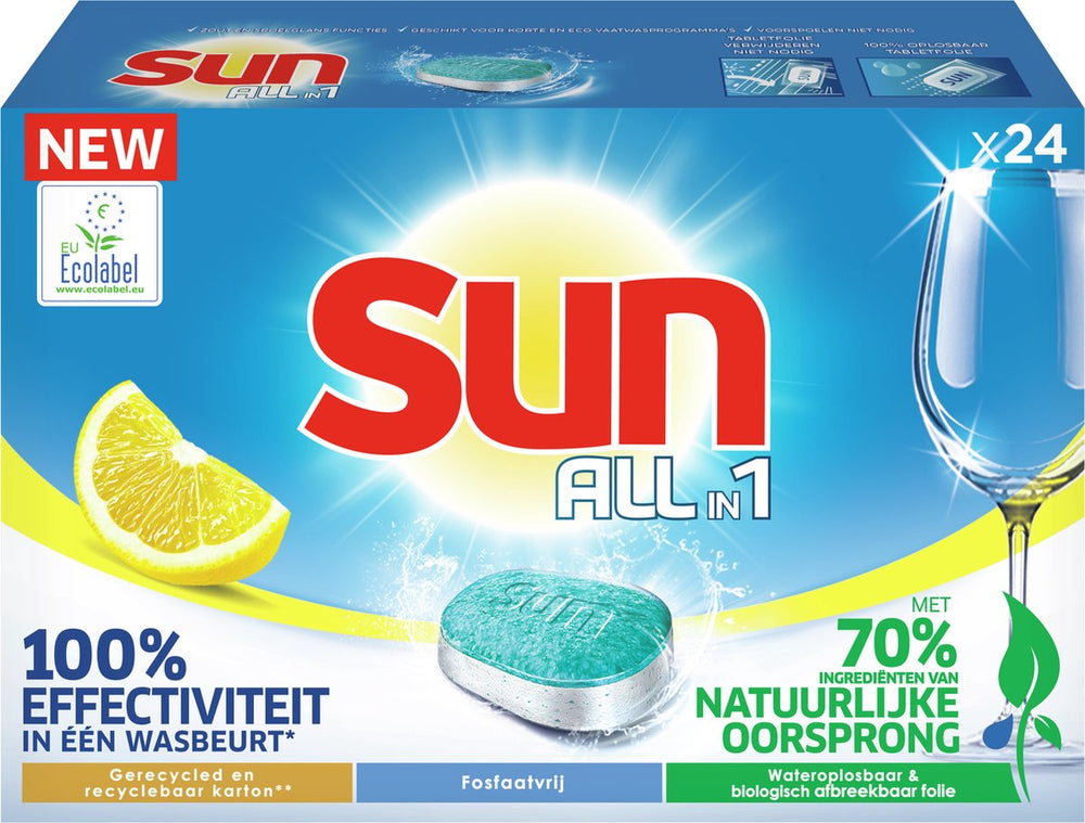 Leg eenvoudig één tablet in het daarvoor bestemde vak en start je gekozen programma. De fijne oplosbare folie lost volledig op, zonder residu achter te laten op je servies. Het resultaat is blinkend-schoon servies en bestek, vrij van vlekken of aanslag. De Sun All-in-1 formule is geschikt voor een breed scala aan vaatwasprogramma’s en materialen, waardoor hij een veelzijdige keuze is voor huishoudens die gemak en hoge reinigingskracht waarderen.